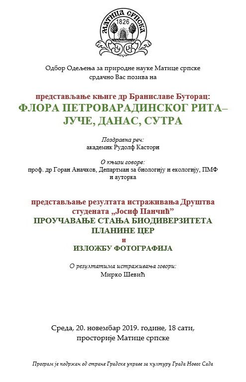 Knjiga dr Branislave Butorac "Flora petrovaradinskog rita - juče, danas, sutra" (Matica Srpska, 2018) biće predstavljena u sredu 20. novembra 2019. godine u 18 sati u prostorijama Matice srpske u Novom Sadu. Pozdravnu reč izreći će akademik Rudolf Kastori, a o knjizi će govoriti prof. dr Goran Anačkov, direktor Departmana za biologiju i ekologiju PMF-a u Novom Sadu i autorka, botaničarka Pokrajinskog zavoda za zaštitu prirode u penziji. Ulaz je slobodan.
